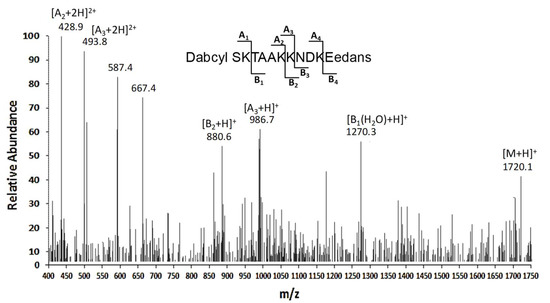 The digestion mixtures were then directly analyzed through LC-ESI-IT-MS experiments (Figure 2), and resulting signals allowed for the deduction of information on the corresponding reaction products, and consequently on the hydrolysis sites. In particular, the peptide fragment DABCYL-26SKTAA31K was primarily detected in this mixture, as deduced by the presence of the signal related to (A2 + 2H)2+ ion at m/z 428.9; consistently, the peak at m/z 880.6 corresponding to MH+ ion of the complementary peptide 32KNDKE36-EDANS (B2 + H)+ was also identified. A consistent proteolytic cleavage at Lys32 was also observed, based on the identification of the peptide Dabcyl-26SKTAAKK32 showing (A3 + H)+ and (A3 + 2H)2+ ions at m/z 986.7 and 493.8, respectively. In addition, the signal at m/z 1270, which was associated with the adduct (M + H2O − H)+ ion of the fragment TAAKKNDK36E-EDANS, also suggested Lys27 as minor potential peptide cleavage site.