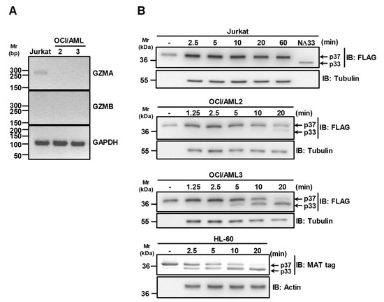 Since Granzyme B (GZMB) and A (GZMA) have been reported as able to cleave the N-terminal region of APE1 [11], RT-PCR analysis on RNA extracted from OCI/AML2 and OCI/AML3 cells was carried out to check the expression of these proteases in the aforementioned cells. The data reported in Figure 3A clearly show that neither OCI/AML2 nor OCI/AML3 cells express this form of GZMA and GZMB, in contrast to Jurkat cells used as a positive control for GZMA expression [24]. In addition, the reported cleavage of APE131-34Ala and APE1K4pleA (Figure 1B,C) definitively excluded a major contribution by GZMA, as these mutants are resistant to GZMA degradation [11].