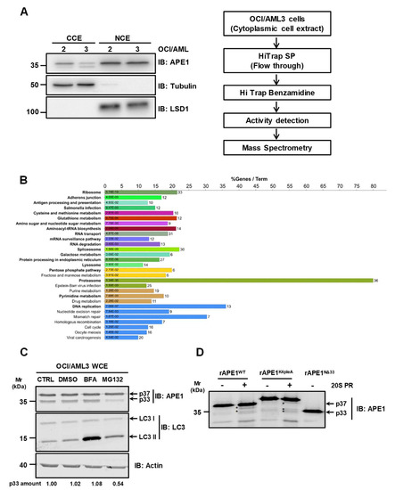 The 20S proteasome is involved in APE1 cleavage. (A) Purification strategy used for the isolation of the protease(s) responsible for APE1 truncation in OCI/AML3 cells. Schematic depiction of the workflow used in this study. A OCI/AML3 cytoplasmic lysate (≈ 108 cell equivalents) was loaded onto a HiTrap SP Sepharose column. The resulting flow-through, enriched for negative charged proteins, was loaded on a HiTrap Benzamidine column; serine-proteases retained were then eluted and each fraction was screened for protease activity. Positive fractions were subjected to proteomic analysis for protein identification. Representative Western blotting analysis on nuclear and cytoplasmic extracts of OCI/AML 2 and 3 cell lines, which shows the cytoplasmic localization of the truncated APE1 form in OCI/AML3 cells. Tubulin and LSD1 were used as markers of cytoplasmic and nuclear localization, respectively. (B) Functional annotation of the proteins identified in the activity-based positive fractions as deriving from proteomic analysis. Functionally enriched terms (Benjamini-Hochberg adjusted p ≤ 0.05) were identified using the Cytoscape plugin ClueGO, querying the KEGG pathway metabolic database; results were summarized as bar charts. Bars length represents the percentage of overall proteins associated with the functional term, which are also present in the examined positive fractions; the exact number of protein associated with each term is shown on the right of each bar, while the Benjamini-Hochberg adjusted p-value is shown inside the bars. Each color corresponds to one functional cluster, with cluster representatives highlighted in bold. See Supplementary Table S2 for detailed information. (C) Inhibition of the proteasome activity reduces APE1 truncation in OCI/AML3 cells. Representative Western blotting analysis on OCI/AML3 cells treated with 10 µM of MG132 and 100 nM of BFA for 4 h. Results showed a reduced protease activity in response to MG132. LC3-I to LC3-II conversion was used as positive control of autophagy induction. Actin was used as loading control. The amounts of the APE1 cleaved protein band, normalized to untreated cells, are indicated under each corresponding lane. (D) APE1 recombinant proteins (APE1WT and APE1K4pleA) were incubated in the absence or in the presence of the 20S proteasome (20S PR); reaction products were analyzed by 12% SDS-PAGE and Western blotting. Asterisks indicate cleavage products. APE1NΔ33 mutant was loaded as a control for molecular mass comparison.