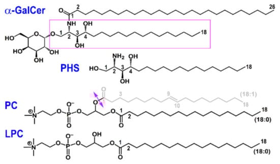 Lipid antigens considered in this study. The 18-C tail of α-GalCer (α-galactosylceramide) boxed in magenta is PHS (phytosphingosine). The hydrolysis of PC (phosphatidylcholine) at the bond indicated with the double magenta arrow yields LPC (lysophosphatidylcholine).