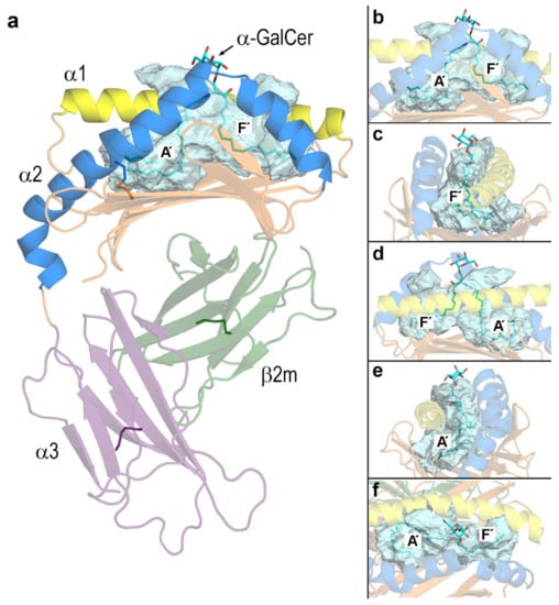 (a) Crystal structure of human CD1d‒α-GalCer complex (PDB id 1ZT4 []). The antigen-binding domain is composed of the α1 (yellow) and α2 (blue) helices that sit above a β sheet platform (orange). This α1+α2 segment is linked to the α3 domain (violet) that attaches CD1d to membranes through a transmembrane segment (not shown). The β2m domain (green) is linked non-covalently to the α domain. The pocket detected by DoGSite is shown as a transparent surface (cyan). A′ and F′ denote the two hydrophobic channels that are filled with the two tails of α-GalCer (sticks with carbons in cyan). (b)-(e) Zoomed views rotated 90° around a vertical axis and (f) top view of the portal.