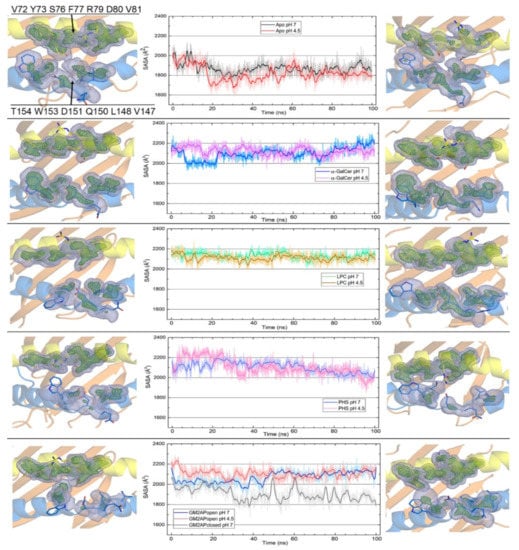 The information provided by the dynamic evolution of SASAs, and these occupancy volumes illustrate a key feature of this portal entrance: the extent of its aperture depends on (i) whether a ligand is harbored in the binding groove or not, (ii) the type of ligand, (iii) whether the helper protein in case of complex with CD1d has the proper conformation for interaction or not, and (iv) pH (Figure 5). The final structures of apo-CD1d show that occupancy volumes of the two flanking helical regions are close at pH 7 and even closer at pH 4.5, a result that indicates that the portal entrance remains nearly closed over the simulation. In addition, 0.5 and 0.9 volumes differ from each other in apo-CD1d. This result indicates that the outer segments of side chains (0.5 occupancy) move freely with respect to more rigid segments (0.9 occupancy) in the residues in the portal entrance, being this effect slightly more noticeably at pH 4.5 than at pH 7. The SASA of these two flanking helical regions decreases at the very beginning of the simulation and then remains at ~1900 Å2 although this decrease is overall smaller at pH 4.5. This result suggests that the portal entrance in CD1d closes immediately in the absence of ligand.
