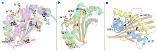 All the mentioned Trp residues are located in β strands except Trp63 (located in the α1 helix) in both CD1a and CD1d, and Trp140, Trp153, and Trp160 (located in the α2 helix) only in CD1d (Figure 6a: the structures deposited most recently in the PDB with the references indicated in the caption to Figure 6 are used for human CD1a, CD1b, and CD1c). Among the three tryptophans strictly conserved in all isotypes (31, 40, and 53 in CD1d), only one (Trp40) is involved in lipid-binding. This residue acts as a lid restricting the space available to acyl chains of lipid antigen in the cavity []. As for tryptophans present in all except one isotype (23 and 131 in CD1d), Trp23 is oriented towards the β2m domain whereas Trp131 is involved in lipid binding forming part of the inner wall inside the cavity. Trp14 and Trp51, only present in CD1a, have different structural roles as the former has its side chain interacting with the lipid in the hydrophobic groove while the latter is oriented towards the α3 domain. The conclusion of this comparative analysis is that among the five CD1 isotypes, only CD1d has tryptophans in the portal helices (Figure 6a) and besides, three of them (140, 153, and 160) are exposed to solvent Although Trp63 (also present in CD1a) and Trp140 are too far from the portal entrance to expect them to directly participate in lipid-binding, Trp153 and Trp160 are in the close neighborhood of that entrance (Figure 6b,c).
