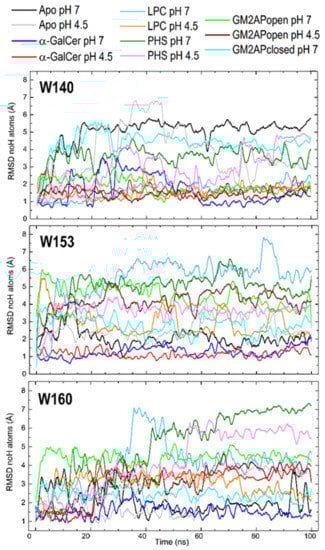 Trp160 shows RMSD curves that reach an equilibrium after ~40–50 ns separating into three groups: greater values > 5 Å for the CD1d‒PHS complex, smaller values < 2 Å for apo-CD1d, the isolated state after dissociation of complex with GM2APclosed and CD1d-α-GalCer complex (the three at pH 7), and intermediate values between ~2.5 and 4.5 Å for the remaining systems (Figure 7). Given that Trp160 is located in the middle of one of the two segments that make the α2 helix (Figure 6) far from the portal entrance where the headgroups of ligands are exposed, the mobility of its side chain must in turn be determined by changes in the helix α2 upon complexation (see Section 3.4).