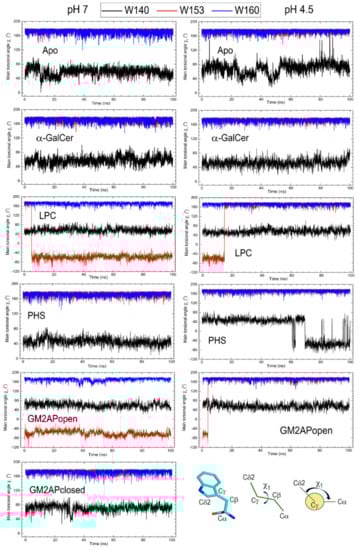 Changes of the main torsional angle χ1 defined at bottom right for tryptophans 140, 153, and 160 in CD1d computed along all-atom MD 100 ns trajectories for all the CD1d systems studied in this work. Plots in the left column correspond to pH 7 and plots in the right column to pH 4.5.