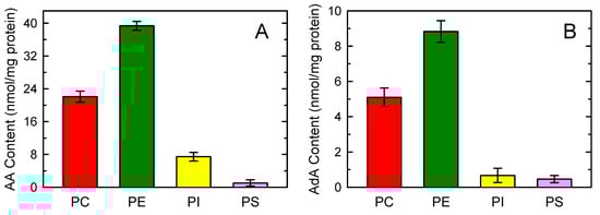 Figure 2 shows the distribution of AA- and AdA-containing phospholipid molecular species, as analyzed by liquid chromatography coupled to tandem mass spectrometry (LC/MS). In agreement with previous estimates [21,22], multiple AA-containing species were detected, with the alkenylacyl and diacyl ethanolamine phospholipid species PE(P-16:0/20:4), PE(P-18:0/20:4), and PE(18:0/20:4) predominating, followed by the diacyl choline phospholipid species PC(16:0/20:4) and PC(18:0/20:4), and the unique inositol phospholipid species PI(18:0/20:4)