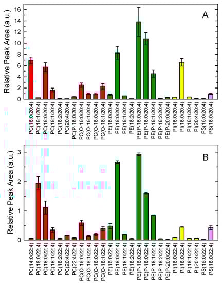 AA and AdA-containing phospholipid molecular species in peritoneal macrophages The profiles of AA- (A) or AdA- (B) containing PC (red), PE (green), PI (yellow), and PS (pink) species in peritoneal macrophages were determined by liquid chromatography/mass spectrometry (LC/MS). Fatty chains within the different phospholipid species are designated by their numbers of carbons and double bonds. A designation of O- before the first fatty chain indicates that the sn-1 position is ether linked, whereas a P- designation indicates a plasmalogen form (sn-1 vinyl ether linkage) [47]. Phospholipids containing two ester bonds have no designation. Results are shown as mean values ± standard error of the mean (n = 3).