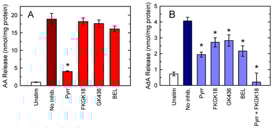 3.2. Defining the Role of Various PLA2 Forms in Stimulus-Induced AA and AdA Mobilization