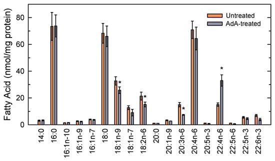Fatty acid composition of murine peritoneal macrophages. The cells were either untreated (orange bars) or treated with exogenous AdA for 20 h (gray bars). Afterward, the total fatty acid profiles in cells were determined by GC/MS after converting the fatty acid glyceryl esters into fatty acid methyl esters. The fatty acids are designated by their number of carbon atoms, and after a colon, their number of double bonds. To differentiate isomers, the n − x (n minus x) nomenclature is used, where n is the number of carbons of a given fatty acid and x is an integer that gives the position of the last double bond of the molecule when subtracted from n. The data are expressed as mean values ± standard error of the mean of three individual replicates. Note: * p < 0.05, significantly different from incubations in the absence of AdA.
