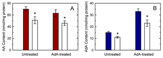 AA and AdA mobilization in zymosan-stimulated macrophages. The cells were either untreated or treated with exogenous AdA for 20 h (see x-axis). Afterward, the cells were unstimulated (colored bars) or stimulated (open bars) with 1 mg/mL zymosan for 1 h, and cellular AA content (A) or AdA content (B) was determined by GC/MS. Results are shown as mean values ± standard error of the mean (n = 3). Note: * p < 0.05, significantly different from unstimulated cells.