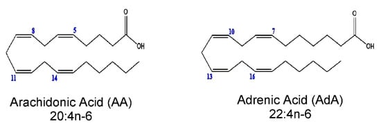 - Campbell, W.B.; Falck, J.R.; Okita, J.R.; Johnson, A.R.; Callahan, K.S. Synthesis of dihomoprostaglandins from adrenic acid (7,10,13,16-docosatetraenoic acid) by human endothelial cells in culture. Biochim. Biophys. Acta 1985, 837, 67–76. [Google Scholar] [CrossRef]