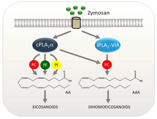 The scheme shows that cPLA2α and iPLA2-VIA are differentially involved in AA and AdA mobilization by zymosan-stimulated mouse peritoneal macrophages.