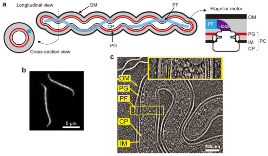 A schematic of the basic structure shared among spirochete species is shown in Figure 1a. The protoplasmic cylinder consists of a cytoplasm, a cytoplasmic membrane, and a peptidoglycan layer, which is covered by the outer membrane. Each PF filament connects with a basal motor called the flagellar motor that is embedded in the cytoplasmic membrane and the peptidoglycan layer via a short, bent structure corresponding to the universal joint hook in the E. coli flagellar motor (details are described below) [3]. The morphologies of the cell body and the PF as well as the number of PFs greatly differ among species, and those of three representative species are summarized in Table 1. The cell body of Borrelia spp. exhibits a flat-wave shape and contains 7~11 PFs long enough to overlap with those extending from the other end at the center of the cell body [4,5,6,7]. Brachyspira spp. appear to have a flat-wave body because of their non-spiral, almost straight configuration observed in swimming cells [8], but no explicit evidence has been reported. Brachyspira PFs overlap at the cell center, and so do those of Borrelia [9]. The cell morphology of Leptospira spp. is distinguished from the other two spirochetes by a small cell width and short wavelength [4,10]. The protoplasmic cylinder of Leptospira (Figure 1b,c) is relatively rigid, maintaining the helix parameters even during swimming, whereas both ends of the cell body are frequently transformed, as described later [11,12,13,14]. Unlike Borrelia and Brachyspira, PFs of Leptospira are too short to overlap [15].
