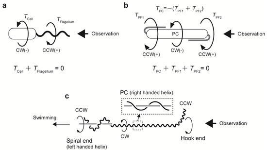 The flagellar motor rotates both CCW and CW, and a reversal of the direction of motor rotation results in a change in the swimming direction. In E. coli, a rotational switch from CCW to CW unravels the flagellar bundle and thus causes an instant tumbling motion, which is followed by swimming in a randomly determined direction upon returning to CCW rotation [24,33]. Motor reversal from CCW to CW rotation in the polarly flagellated bacterium V. alginolyticus changes the swimming direction from forward to backward, whereas the reversal from CW to CCW causes “buckling” of the flagellum at the hook, resulting in a 90 degree change in swimming direction [54]. These motor reversal-based changes in swimming direction are related to bacterial chemotaxis, which may be stimulated by chemicals, temperature, light, and other trigger mechanisms [55]. In spirochetes, rotational directions of PFs are important for directed swimming [6,44]. According to the schematic structure shown in Figure 1a, the flagellar motors residing at both cell ends have to rotate in opposite directions to each other; if they rotate in the same direction, the cell body will not be rotated due to the counterbalance of torques generated by the two motors or the inability to swim due to a twist of the cell body. This mechanical model suggests that asymmetric rotation and synchronized motor reversal between PFs are required for the cells to swim smoothly and change swimming direction [44].