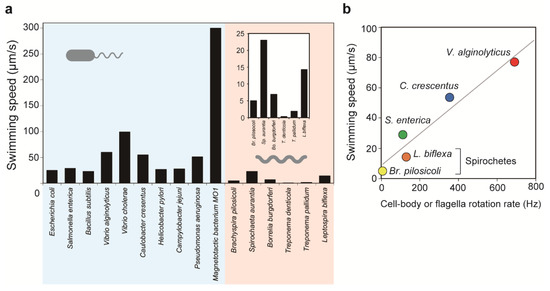 - Magariyama, Y.; Sugiyama, S.; Kudo, S. Bacterial swimming speed and rotation rate of bundled flagella. FEMS Microbiol. Lett. 2001, 199, 125–129. [Google Scholar] [CrossRef]