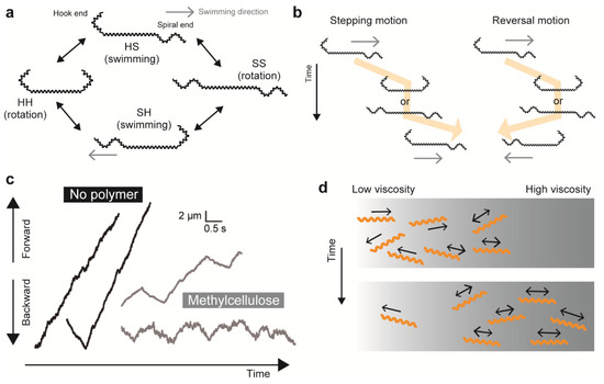 Leptospira are known to be attracted to higher viscosity, and the mechanism of this so-called “viscotaxis” was explained by the viscosity-dependent increment of swimming speed [86]. However, a recent motility study using Leptospira proposed another plausible model of taxis-like behavior, which was based on the result that a change in viscosity affects the reversal frequency in swimming direction [13]. When a leptospiral cell swims with the anterior spiral (S) end and the posterior hook (H) end (SH form), the transformation into symmetric cell morphology (SS or HH form) interrupts swimming transiently, although the cell keeps rotating (Figure 4a). Leptospiral swimming is restarted by transformation from symmetric to asymmetric forms, and the swimming direction after exhibiting symmetric morphologies is determined by the cell forming SH or HS. The transformation process of SH-SS/HH-SH causes a pause of swimming but does not change the swimming direction (stepping movement), whereas SH-SS/HH-HS turns the swimming direction by 180 degrees (reversal movement) (Figure 4b) [13]. Takabe et al. measured the stepping and the reversal events of individual leptospiral cells in various viscous solutions containing methylcellulose, Ficoll, or the major viscous agent for tissue mucin, showing that the reversal frequency increased with viscosity (Figure 4c) [13]. The reversal movement returns the cell to its original position, indicating that there is no net migration. Thus, viscosity-dependent impairment of net migration occurs due to the increment of the reversal event that results in trapping leptospires in areas with higher viscosity, which could assist the accumulation of spirochetes in the mucus layer in vivo (Figure 4d).