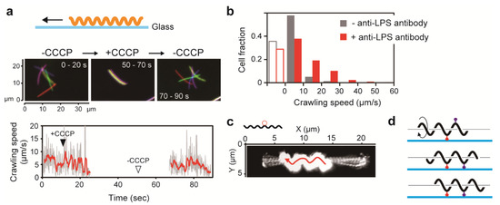 Pseudomonas aeruginosa not only swim with a polar flagellum but can also move on a solid surface using pili in a process called twitching motility [2,95]. To that effect, ambivalent motility of P. aeruginosa is realized by two distinct machineries specialized for movement in liquid and on solid media, respectively. A major motility form of spirochetes is swimming, but Leptospira spp. can move both in liquid and on solid surfaces. Cox and Twigg first reported leptospiral snake-like movement on a smooth surface, which was called “crawling” [96]. For moving while attached to surfaces, Mycoplasma mobile uses abundant leg-like protein complexes that are expressed on the cell surface; these legs successively catch and release sialylated oligosaccharides on surfaces, thereby propelling the cell [97]. Another gliding bacterium, Myxococcus xanthus, has a machinery that is composed of intracellular motor proteins and an external adhesive complex (Agl-Glt) [98]. Leptospiral swimming is a result of flagella-dependent motility, but a machinery specialized in crawling has yet to be identified. Charon et al. observed that microbeads attached to the leptospiral cell surface via anti-whole cell antibody freely move along the cell body, suggesting that unspecialized antigens residing on the outer sheath are involved in crawling motility by functioning as mobile adhesins [99]. A recent study by Tahara et al. showed that crawling is completely inhibited by CCCP, indicating that PMF-dependent PF rotation drives crawling (Figure 5a) [73]. Furthermore, it was revealed that modification of glass surfaces with anti-lipopolysaccharide (LPS) antibody affects the crawling speed and that anti-LPS antibody-coated microbeads move on the outer bacterial membrane. These results suggest that LPS is responsible for crawling, serving as one of the adhesins anchoring the cell to the surface (Figure 5b–d) [73]. Electron microscopic observation of a hamster liver infected by pathogenic leptospires showed entry of leptospiral cells into the intercellular junction of hepatocytes [100], implying that leptospiral pathogenicity could involve adherence of spirochetes to host cells, followed by crawling (discussed in Section 7).