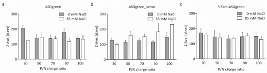 The Z-average hydrodynamic diameter of CS–ASO nanocomplexes at varying P/N charge ratios. The size of CS–ASO nanocomplexes with (a) ASOgreen, (b) ASOgreen_sense and (c) 5′Fam-ASOgreen varied between 100 and 200 nm. On average, nanocomplexes prepared in the presence of 85 mM NaCl were smaller than nanocomplexes prepared without NaCl (n = 3).