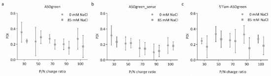 The hydrodynamic diameter of the nanocomplexes varied between ~100 and ~200 nm (Figure 1) while no apparent trend regarding the P/N charge ratio was observed. However, on average, nanocomplexes formed in the presence of NaCl appeared to be of a smaller size. Higher ionic strength has been shown to be beneficial for CS particle formation, decreasing the particle size with increasing NaCl concentrations [27,28]. NaCl screens out the charges of CS and thereby lowers repulsive electrostatic forces, potentially reducing aggregation. Furthermore, NaCl reduces the stiffness of CS chains, leading to the formation of more compact particles. This is reflected in the measurements of the PDI of the nanocomplexes, as nanocomplexes formed in the presence of NaCl displayed a lower PDI than nanocomplexes formed without salt (Figure 2). Similar results have been reported by Sawtarie et al., who observed a narrower size distribution of CS–tripolyphosphate particles with increasing NaCl concentration, reinforcing the theory [29]. Interestingly, the nanocomplexes of CS–ASOgreen_sense in 85 mM NaCl, showed a consistent increase in size with P/N charge ratio. This result evidenced the possibility that CS and ASOgreen_sense formed nanocomplexes different in kind to those of ASOgreen, a suggestion that was also confirmed by the results of the of zeta potential as explained below (Figure 3).