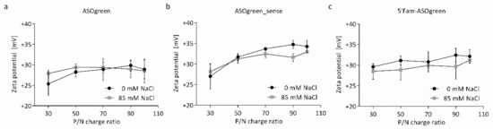 The zeta potential of the nanocomplexes was determined from their electrophoretic mobility and is displayed in Figure 3. The zeta potential increased with increasing P/N charge ratio from approximately +25 to +35 mV. On average nanocomplexes prepared in the presence of 85 mM NaCl had a lower zeta potential than nanocomplexes prepared without NaCl. Of note, the non-linear dependence of zeta potential with P/N ratio observed between the CS–ASOgreen and CS–ASOgreen_sense is different (Figure 3a,b, respectively), with a greater exponent for the latter. In addition, the nanocomplexes formed with the fluorescently labelled ASO showed a linear dependence between zeta potential and P/N ratio by contrast with the other two systems that showed a non-linear profile.