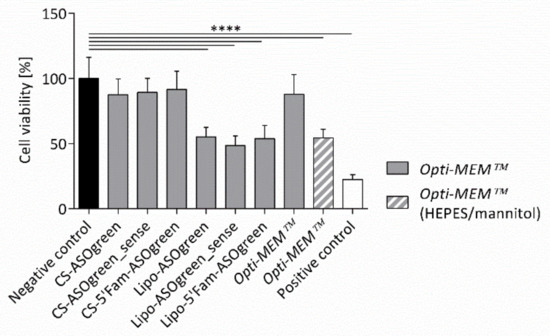 Before conducting transfection experiments with CS–ASO nanocomplexes, the effect of the nanocomplexes on cell viability was determined. NCI-H441 cells were incubated with the nanocomplexes and controls for 24 h. Subsequently, a MTT assay was carried out. The test showed that CS–ASO nanocomplexes did not have a significant effect on the viability of the cells, while Lipofectamine-containing systems displayed highly significant cytotoxicity (Figure 6). Furthermore, the test confirmed the negative impact of the high osmolality of Opti-MEM™ supplemented with HEPES and mannitol as the transfection medium displayed a highly significant impairment of the cell viability compared to Opti-MEM™ without supplements. After ruling out cytotoxicity of the nanocomplexes, transfection experiments were performed.
