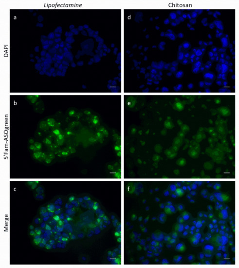 Representative confocal laser scanning microscope (CLSM) images of NCI-H441 cells transfected with 5′Fam-ASOgreen. Cells were transfected using (a–c) Lipofectamine and (d–f) CS. Images were taken 24 h after transfection. (a,d) DAPI; (b,e) 5′Fam-ASOgreen; (c,f) Merge (scale bar = 20 µm).