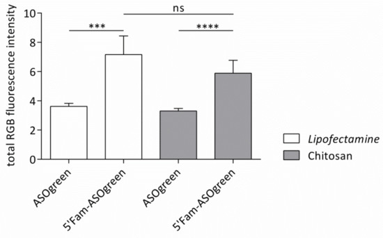Fluorescence intensities of NCI-H441 cells transfected with ASOgreen and 5′Fam-ASOgreen. Cells were transfected with the fluorescent 5′Fam-ASOgreen as well as the non-fluorescent ASOgreen as controls. Lipofectamine and CS were used as transfection reagents. Total RGB fluorescence intensity was determined 24 h after transfection (non-significant (ns), p ≤ 0.001 (***), p ≤ 0.0001 (****); n = 12).