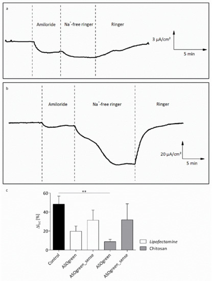 In order to test the ability of the ASOs to functionally downregulate ENaC activity, NCI-H441 cells were transfected with 0.45 µg/cm2 ASOgreen and ASOgreen_sense as controls using CS and Lipofectamine, respectively. Twenty-four hours after transfection, Ussing chamber measurements were conducted to monitor ENaC function. During the measurements, ENaC was blocked by the specific blocker amiloride followed by complete apical withdrawal of Na+ with the purpose of determining the amount of amiloride-sensitive Na+ current. In non-transfected control cells, only a very slight decrease in short-circuit current was observed after the removal of Na+ (Figure 9a). This suggests that most of the Na+ current is mediated by ENaC. On the contrary, in cells transfected with ASOgreen using CS, the decrease in short-circuit current after application of Na+-free Ringer solution was much greater, indicating that only a minimal amount of Na+ current is mediated by ENaC (Figure 9b). Statistical evaluation of the short-circuit current confirmed these observations (Figure 9c). After transfection with ASOgreen, the amiloride-sensitive current decreased notably compared to non-transfected control cells. In cells transfected using CS, the decrease was significant (48.4 ± 8.5% vs. 8.9 ± 2.4%; p ≤ 0.01), thus demonstrating successful downregulation of ENaC by ASOgreen. Of note, CS nanocomplexes outperformed Lipofectamine transfections. Transfection with the sense control ASOgreen_sense led to a slight decrease in amiloride-sensitive current. However, no significant difference to control cells was identified, confirming, as expected, that ASOgreen_sense had no effect on ENaC expression.