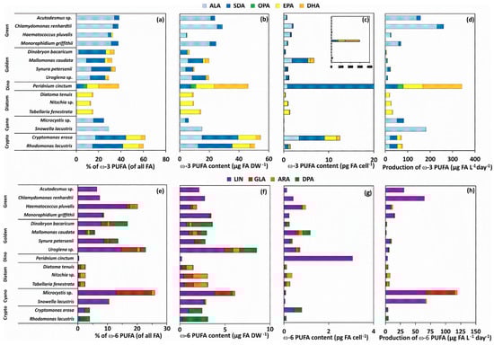 The proportion of all fatty acids (a,e), per biomass content (b,f), per cell content (c,g), and daily production (d,h) of ω-3 (ALA, SDA, OPA, EPA, DHA) and ω-6 (LIN, GLA, ARA, DPA) PUFA in cultured 16 phytoplankton strains.