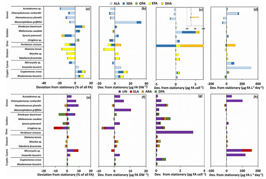 The deviation of ω-3 (ALA, SDA, OPA, EPA, DHA) and ω-6 (LIN, GLA, ARA, DPA) PUFA between exponential and stationary phases: proportion of all fatty acids (a,e), per biomass content (b,f), per cell content (c,g), and daily production (d,h).