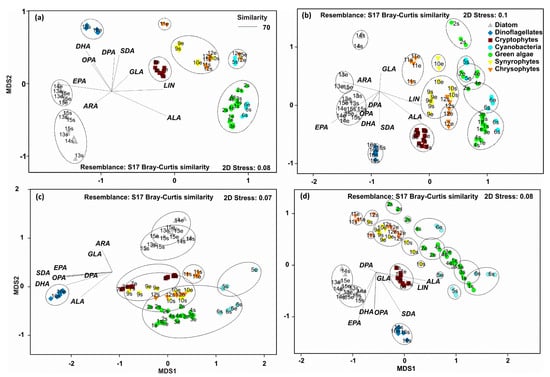 Non-metric multidimensional scaling plots of Bray Curtis similarity of percentages (a), biomass content (b), cell content (c), and daily production (d) of ω-3 (ALA, SDA, EPA, DHA) and ω-6 (LIN, GLA, ARA, DPA) PUFA in cultured 16 phytoplankton strains (see Table 1). Golden algae are divided here into Synyrophytes and Chrysophytes to demonstrate the difference in these classes. Abbreviations after strain number: e = exponential phase and s = stationary phase.