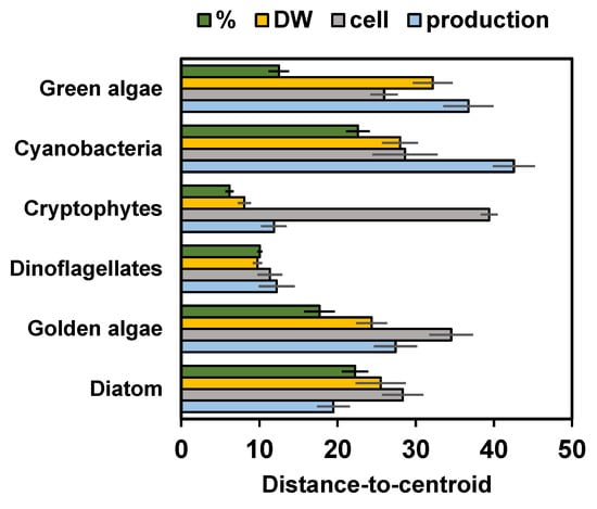 According to the PERMANOVA (Table 2) the contribution of ω-3 and ω-6 PUFA differed between strains by the taxa, but also by the growth phase. Taxa explained 84% of all variation, but growth phase explained only 1% of the variation. Pairwise PERMANOVA (t = 2.58–27.8, P(MC) < 0.003) showed that the contribution of ω-3 and ω-6 PUFA differed among phytoplankton main groups. However, non-metric multidimensional scaling analysis (Figure 4) clustered (CLUSTER analysis) Snowella with green algae and Microcystis with exponential phase of Uroglena together by 70% similarity excluding. Furthermore, NMDS output of percentages of ω-3 and ω-6 PUFA separated strains by growth phase. Pairwise PERMANOVA (t = 3.7–7.1, P(MC) = 0.001) showed statistical difference between exponential and stationary phase for green algae, diatoms, dinoflagellates, and cryptophytes, but not for cyanobacteria or golden algae (t = 0.75–1.01, P(MC) = 0.35–0.55). The contribution of ω-3 PUFA was higher in exponential phase in green algae, dinoflagellates, and diatoms, whereas cryptophytes and chrysophytes (excluding Synura) had higher contribution of different ω-3 PUFA in stationary phase (Figure 3). The contribution of LIN in green algae and cyanobacteria was higher in stationary phase than in exponential phase. Otherwise, similar clear trends were not seen in the contribution of ω-6 PUFA with other taxa. Permutational analysis of multivariate dispersions (PERMDISP) showed lowest dispersion among cryptophytes and green algae, whereas dispersion was highest within cyanobacteria (Figure 5) reflecting high variation among these phytoplankton classes (Figure 3a).