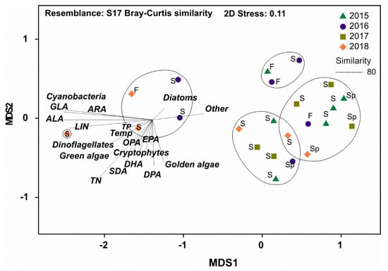 Non-metric multidimensional scaling plots of Bray Curtis similarity of ω-3 (ALA, SDA, EPA, DHA) and ω-6 (LIN, GLA, ARA, DPA) PUFA concentration of phytoplankton (µg PUFA L −1), main phytoplankton groups and physico-chemical parameters in Lake Vesijärvi in years 2015–2018. TN—Total Nitrogen, TP—Total Phosphorus, Temp—temperature in the epilimnion. S = summer, F = fall, Sp = Spring.