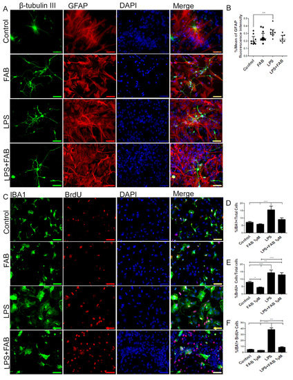 Microglia were examined using immunolabeling for Iba-1, a general microglial marker that identifies both M1 and M2 phenotypes [19]. In controls, microglia had a process-bearing phenotype, which was also observed after FAB treatment alone (Figure 2C). In contrast, treatment with LPS clearly induced an increase in the proportion of cells with an amoeboid phenotype, which is characteristic of phagocytic M1 microglia (Figure 2D), as well as microglial proliferation determined by BrdU incorporation (Figure 2E). After treatment with FAB, there was an evident decrease in the number of amoeboid microglia (Figure 2C). Quantitation demonstrated that LPS treatment resulted in a doubling of microglial numbers (Figure 2D) and microglial proliferation (Figure 2F, Iba-1+/BrdU+ cells), and these were significantly decreased by FAB (Figure 2D,F). Interestingly, LPS induced an overall increase in cell proliferation in the cultures and this was not significantly affected by FAB (Figure 2E), an effect that might be related to neuronal and astroglial proliferation.