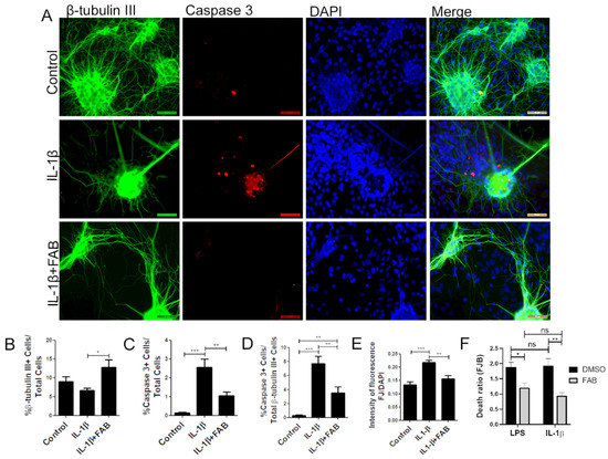 In order to analyze whether FAB also protects against neuroinflammation induced by IL-1β, neuron–glial cocultures were exposed to 10 ng/mL IL-1β for 24 h and then treated with FAB (1 µM) for 24 h. IL-1β is a proinflammatory cytokine highly expressed in neuroinflammatory conditions and an important immune mediator involved in a variety of cellular activities [20]. The same features were found regarding IL-1β compared to LPS, and FAB was able to preserve neuronal morphology (Figure 4A) and increase the number of β-tubulin-positive neurons compared with IL-1β treatment (Figure 4B). As with LPS, IL-1β increased the number caspase+ cells overall (Figure 4A,C) and specifically β-tubulin-positive neurons (Figure 4A,D) and FJ-B staining of necrotic cells (Figure 4E). Combined treatment with FAB significantly reduced the total cells in apoptosis (Figure 4C), as well as apoptotic neurons (Figure 4D) and necrosis (Figure 4E). Further analysis of Fluoro-Jade B (Figure 4F) showed no significant difference between LPS and IL-1β damage, which suggests that neuroprotection mediated by FAB might be related to the inhibition or control of the IL-1β signaling pathway.