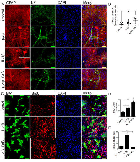 In order to investigate the anti-neuroinflammatory effect of FAB, we performed immunocytochemistry to analyze microglial proliferation and phenotype. After treatment with IL-1β, Iba-1 immunocytochemistry showed that microglia were much larger and presented a more amoeboid/phagocytic phenotype (Figure 5C). In addition, IL-1β markedly stimulated overall proliferation in cell cultures (Figure 5C,D) and specifically microglial proliferation (Figure 5C,E). Treatment with FAB did not have a marked effect on the amoeboid microglial morphology induced by IL-1β treatment (Figure 5C), but it completely inhibited the IL-1β-induced microglial proliferation (Figure 5E). Interestingly, the overall cellular proliferation in the cultures was increased by FAB treatment (24.9%, Figure 5D) in comparison with control (7.8%) and IL-1β damage (15.7%), which is consistent with the apparent increase in neurons and possibly astrocytes observed after FAB treatment (Figure 5A,B).