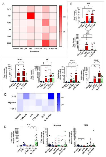 Finally, we investigated whether the neuromodulatory and neuroprotective effects of FAB are associated with changes in expression of regulatory and inflammatory molecules (Figure 7). Once LPS or IL-1β binds to its specific receptor (Toll-like receptor 4 (TLR4) and IL1R, respectively), several signal transduction pathways are activated, which in turn lead to increased expression of inflammatory molecules [21,22], with important roles for IL-1β, TNF-α, IL-6, NOS2, CCL2, and CCL5 in neuronal death [22,23,24,25,26,27], while IL-10, arginase, and TGF-β are important regulatory molecules involved in the control of the inflammatory response and neuroprotection [11,19,28]. Both LPS and IL-1β induced an increase of mRNA expression of neuroinflammatory molecules IL-1β, TNF, and NOS2, as well as the expression of the chemokine CCL2, and these increases were almost completely blocked by FAB treatment (Figure 7A,B). In addition, LPS and IL-1β upregulated IL-6 and CCL5, but these were differentially affected by FAB, which only significantly reduced the effects of LPS on CCL5 (Figure 7A,B). Analysis of the regulatory molecules arginase, IL-10, and TGF-β indicated that FAB only significantly altered IL-10 in IL-1β treatment (Figure 7C,D).