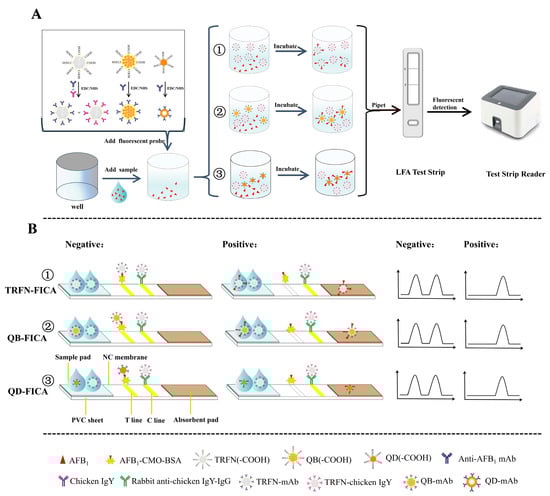 Schematic demonstration of (A) the procedures for aflatoxin B1 (AFB1) detection with fluorescence immunochromatography and (B) the principle of fluorescence immunochromatography assays for time-resolved fluorescent nanobeads (TRFN)-FICA, quantum dot nanobeads QB-(FICA) and quantum dots (QD)-FICA.