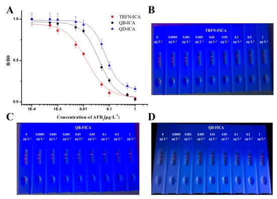 (A) Standard curves of TRFN-FICA, QB-FICA and QD-FICA for AFB1 and (B–D) corresponding immunochromatographic strips.