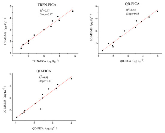 Furthermore, in order to verify and compare the reliability of FICAs, 60 grain samples were analyzed by liquid chromatography–tandem mass spectrometry (LC-MS/MS) [34], TRFN-FICA, QB-FICA and QD-FICA. A total of 12 samples were confirmed as positive samples, while others (48 samples) were negative by LC-MS/MS and three FICAs, and the representative mass chromatograms (highest and lowest concentrations for positive samples) are listed in Figure S6. There were no false negative or false positive results reported by the three FICAs, and analysis of field grain samples by FICAs were in accordance with that of LC-MS/MS (Figure 4). These results indicate that all three FICAs are reliable methods for the determination of AFB1 residues in grains, and that TRFN-FICA obtained the best fit.