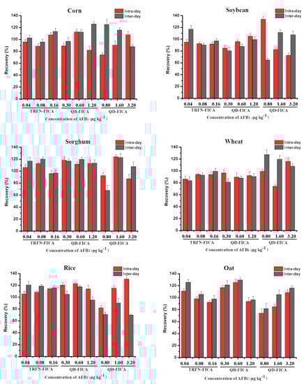 We performed recovery experiments to assess the accuracy and precision of the three FICAs using six kinds of blank grain samples (corn, soybeans, sorghum, wheat, rice and oat) with a series of known concentrations of AFB1. The choices of low, medium and high concentrations with AFB1 were the same as in the previous reported literature [32,33], which were represented by LOD, 2LOD and 4LOD, respectively. Data were obtained from six replicates and on three consecutive days. The intraday and interday recovery of TRFN-FICA ranged from 86.48% to 114.10% and 83.64% to 125.61%, respectively; the coefficient of variation were all less than 10%. Meanwhile, TRFN-FICA had better recovery than QB-FICA and QD-FICA (Figure 5), confirming that the accuracy and precision of TRFN-FICA were better than QB-FICA and QD-FICA.