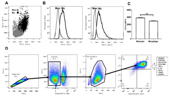 Upon differentiation in the presence of M-CSF for seven days, human monocyte-derived macrophages (MDM) showed significantly higher cell size than monocytes (Figure 1A,B). Furthermore, while monocytes exhibited a typical appearance that consisted of round cells, differentiated MDM appeared as fusiform-shaped cells with numerous pseudopodia that increased their cell complexity with respect to monocytes (Figure 1A,B). Additionally, macrophage differentiation was also confirmed by means of CD14 cell surface expression. In this sense, MDM showed a significant 20% reduction in CD14 expression when compared to that found in monocytes (Figure 1C). Once gated for singlets on a forward scatter height/forward scatter area density plot (Figure 1D), the living cells were gated while using the 7-AAD staining for dead cells. The living monocytes were then gated on a forward scatter area/side scatter area plot to assess CD14 positive expression together with TNF-alpha, IL-1 beta, CD11c, CD206, and CX3CR1, and CCR2 (Figure 1D).