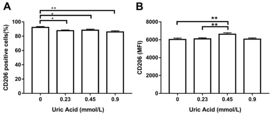 Cell surface expression of CD206 in primary human monocyte-derived macrophages in vitro exposed to uric acid. In vitro exposure to 0.23, 0.45, and 0.9 mmol/L uric acid significantly decreased the percentage of primary human monocyte-derived macrophages expressing CD206 as compared to control cells (0 mmol/L uric acid) (A). In vitro exposure to 0.45 mmol/L uric acid significantly increased CD206 production in primary human monocyte-derived macrophages as compared to control cells (0 mmol/L uric acid) (B). Data were analyzed using one-way ANOVA followed by the post-hoc Tukey test to estimate significant differences. Data are expressed as mean ± standard deviation. Differences were considered significant when p < 0.05 and are marked with asterisks as follows: * = p < 0.01; ** = p < 0.001. CD206, cluster of differentiation 206 or mannose receptor; MFI, mean fluorescence intensity.