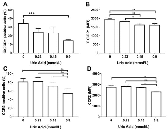 Cell surface expression of CX3CR1 and CCR2 in primary human monocyte-derived macrophages in vitro exposed to uric acid. In vitro exposure to 0.9 mmol/L uric acid significantly decreased the percentage of primary human monocyte-derived macrophages expressing CX3CR1 as compared to control cells (0 mmol/L uric acid) (A). In vitro exposure to 0.45 and 0.9 mmol/L uric acid significantly decreased CX3CR1 production in primary human monocyte-derived macrophages as compared to control cells (0 mmol/L uric acid) (B). In vitro exposure to 0.9 mmol/L uric acid significantly decreased the percentage of primary human monocyte-derived macrophages expressing CCR2 as compared to control cells (0 mmol/L uric acid (C). In vitro exposure to 0.9 mmol/L uric acid significantly decreased CCR2 production in primary human monocyte-derived macrophages as compared to control cells (0 mmol/L uric acid) (D). Data were analyzed using one-way ANOVA followed by the post-hoc Tukey test to estimate significant differences. Data are expressed as mean ± standard deviation. Differences were considered to be significant when p < 0.05 and are marked with asterisks as follows: * = p < 0.01; ** = p < 0.001; *** = p < 0.0001. CX3CR1, CX3C-motif chemokine receptor 1; CCR2, C-C chemokine receptor type 2; MFI, mean fluorescence intensity.