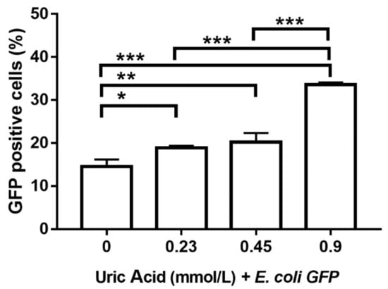Proinflammatory activation of human macrophages is also associated with an increased ability to phagocytose bacteria. Thus, we evaluated the effect of increasing uric acid concentrations on the phagocytic activity of MDM while using E. coli-GFP+. In the absence of uric acid, MDM were able to ingest around 15% of E. coli-GFP+ (Figure 6). Notably, the exposure of MDM to 0.23 mmol/L uric acid induced a significant 26% increase in the intracellular number of E. coli-GFP+ as compared to control cells (Figure 6). Accordingly, MDM exposed to 0.45 and 0.9 mmol/L uric acid showed significant 40 and 120% increases, respectively, in the intracellular amount of E. coli-GFP+ as compared to control cells (Figure 6), which confirmed that uric acid acts as a proinflammatory stimulus for in vitro cultured human macrophages.