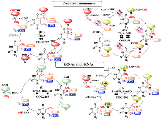 Enzymatic mechanisms of the C5-uracil methyltransferases. The cofactors and flavin coenzyme derivatives are represented as simplified pictograms. The pteridin moiety of the folate derivatives is colored in red, whereas the S-adenosylhomocysteine and the isoalloxazine ring of flavin adenine dinucleotide (FAD) are colored in green and yellow, respectively. Refer to Figure S1 for the chemical structures of the cofactors and FAD coenzyme. For more details about the chemical mechanisms of these enzymatic systems, see references [18,19,20,21,22,25,26,39,40]. Residues playing the role of base in the catalytic cycle are in orange, whereas the nucleophiles are in blue. The bold circles below each protein’s name represent the oligomeric state of the enzyme.