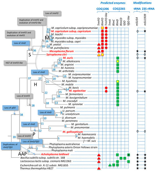These observations show that while fundamentally different types of m5U-modifying enzyme have evolved convergently to modify the same nucleotide target, other m5U-modifying enzymes that are structurally similar have diverged in their functions to modify different RNA sites. In the present study, we investigated how such phenomena might have evolved within the mollicutes. These organisms, with their small genome sizes of ~1 Mbp on average, represent excellent models for defining a minimal set of genes required for life and, more generally, for studying the mechanisms of genome reduction and evolution [42,43,44]. We studied a diverse array of mollicutes to systematically explore the distribution and function of two different SAM- and folate-dependent families of RNA m5U methyltransferases (COG1206 and COG2265), and mapped the complex patterns of acquisition and loss of the genes for these enzymes. The methylation targets of the enzymes were established. Furthermore, we note that the experimental data did not always coincide with bioinformatics predictions, which emphasizes the necessity of empirical testing to obtain reliable functional annotations of these enzymes.