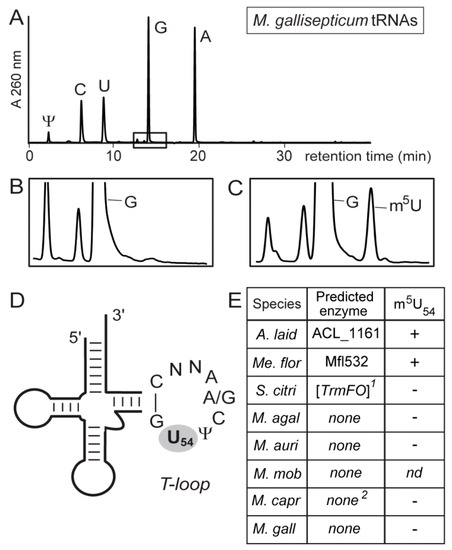 HPLC profiles of tRNA nucleosides from mollicutes bulk tRNAs. (A) The digestion products of total tRNAs from M. gallisepticum showing the positions of the unmodified nucleosides and pseudouridine detected by their absorbance at 260 nm (A260 nm). Under the conditions used here, m5U elutes in the boxed region after guanosine at approximately 15 min. Enlargement of the boxed region (B) for M. gallisepticum and (C) for Me. florum, where only the tRNAs of this latter strain contain m5U. (D) Schematic of the mollicutes tRNAs showing the consensus sequence of the T-loop nucleotides and the position of U54. (E) Mollicutes species shown empirically to have (+) or not have (-) m5U54 in their tRNAs. This modification correlates with the presence of an active TrmFO enzyme predicted by bioinformatics. Species abbreviations: A. laid, A. laidlawii; Me. flor, Me. florum; S. citri, S. citri; M. agal, M. agalactiae; and the additional Mycoplasma species M. auris (M. auri), M. mobile (M. mob), M. capricolum subsp. capricolum (M. capr), and M. gallisepticum (M. gall). 1 The trmFO sequence in S. citri is a nonfunctional pseudogene; 2 M. capr has no trmFO, but possesses a functional rlmFO. nd, not determined.