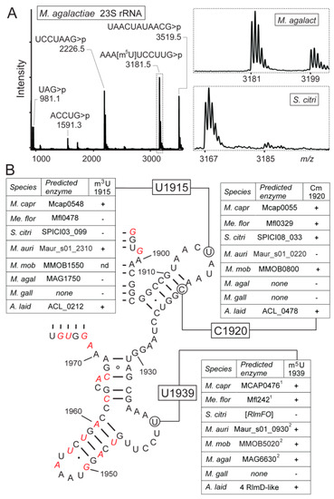- Madsen, C.T.; Mengel-Jorgensen, J.; Kirpekar, F.; Douthwaite, S. Identifying the methyltransferases for m(5)U747 and m(5)U1939 in 23S rRNA using MALDI mass spectrometry. Nucleic Acids Res. 2003, 31, 4738–4746. [Google Scholar] [CrossRef][Green Version]