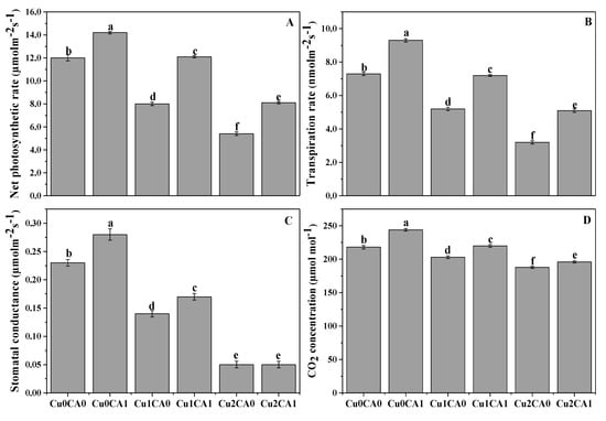 Effect of CA application on net photosynthesis (A), transpiration rate (B), stomatal conductance (C) and intercellular CO2 concentration (D) in the leaves of C. capsularis seedlings grown under different stress levels of Cu. Values are demonstrated as means of three replicates along with standard deviation (SD; n = 3). One-way ANOVA was performed and means differences were tested by LSD (p < 0.05). Different lowercase letters on the error bars indicate significant difference between the treatments. Cu0CA0 (Cu = 0 μM and CA = 0 mM), Cu0CA1 (Cu = 0 μM and CA = 2 mM), Cu1CA0 (Cu = 50 μM and CA = 0 mM), Cu1CA1 (Cu = 50 μM and CA = 2 mM), Cu2CA0 (Cu = 100 μM and CA = 0 mM), Cu2CA1 (Cu = 100 μM and CA = 2 mM).